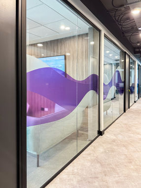 Nuevo proyecto terminado para la oficina de Krontec 🟣 . Las nuevas gráficas instaladas reflejan el espíritu innovador de la empresa tecnológica. Con formas fluidas y orgánicas en tonos púrpura, aportan dinamismo y modernidad al espacio, al mismo tiempo que entregan privacidad sin perder la transparencia y la luminosidad natural. Estas intervenciones no solo decoran, sino que también transmiten la identidad de la marca en cada espacio de la oficina.